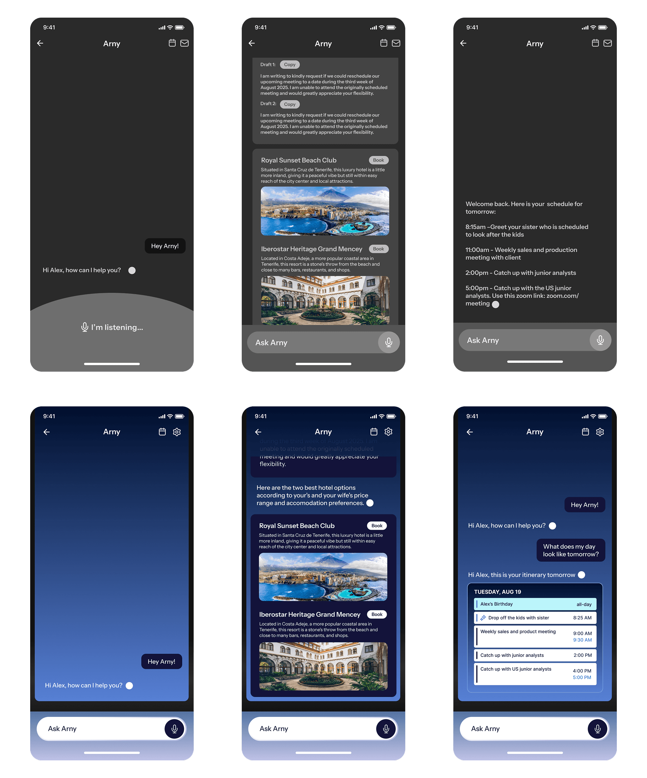 Arny is an AI-powered concierge assistant designed to help users simplify their daily tasks through a conversation based product. My role was to bring Arny to life visually, into a product that felt approachable and intuitive.