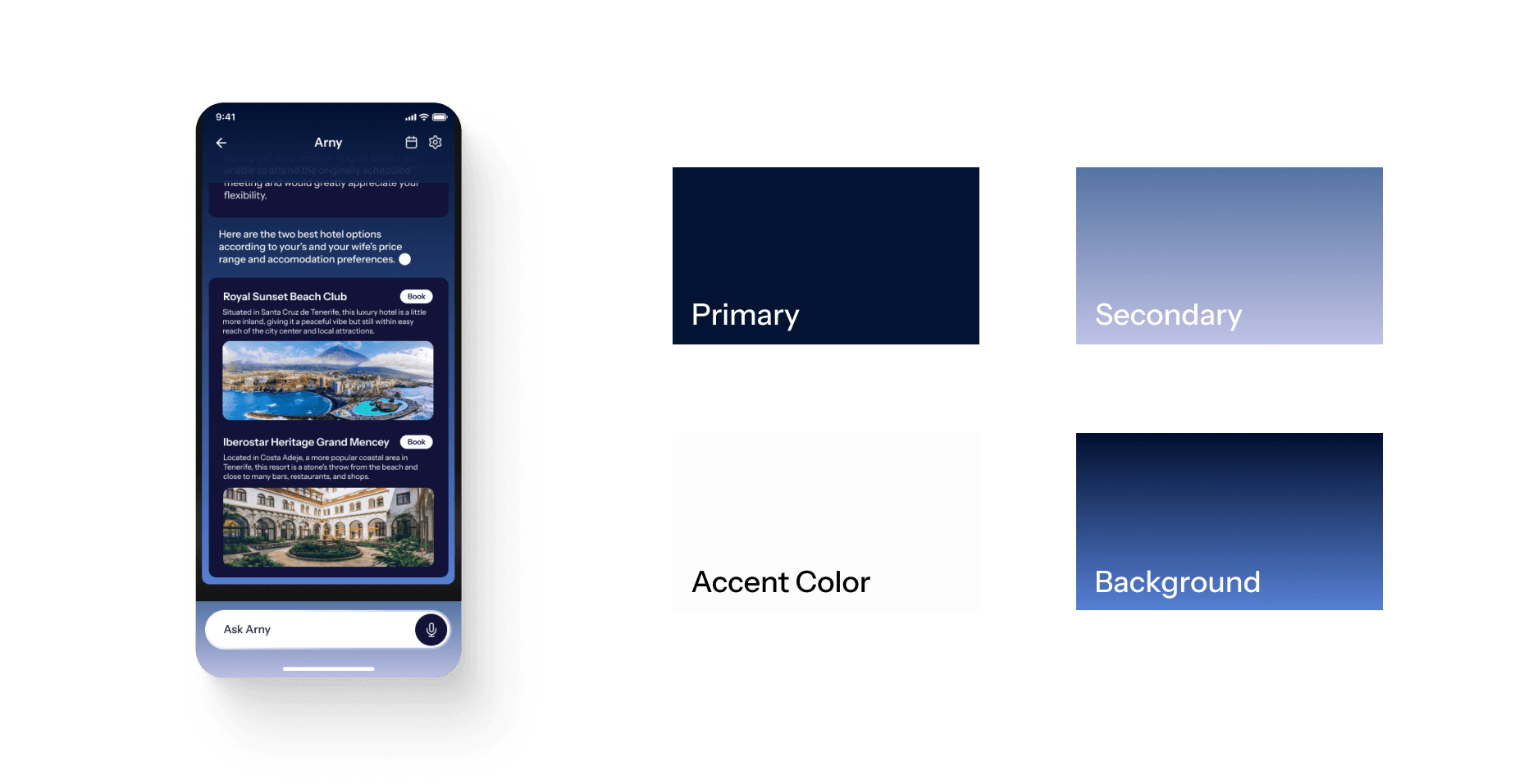 When selecting Arny's color palette, I explored how contemporary AI products have minimal color systems. To provide contrast, I introduced the use of subtle gradients in the background and secondary color to distinguish the product from other chatbot experiences.