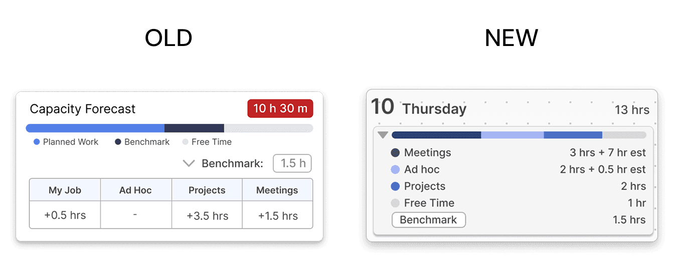 Users found the pre-existing capacity forecast feature valuable as it showed them how much time they had in a day. To improve the discoverability, this view was integrated into the planner, allowing users to see their daily schedule overview at a glance.