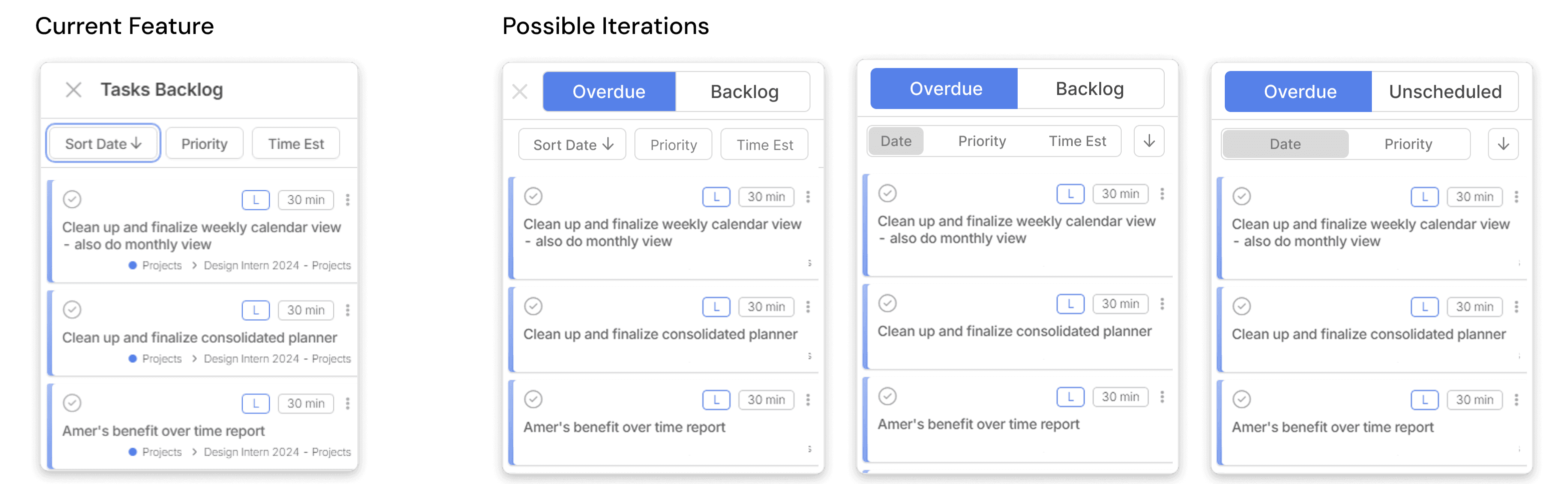 To help users better manage tasks that fall outside their daily plan, I explored an improved backlog experience that separates Overdue and Unscheduled tasks into clear, focused views. Previously, backlog items were grouped together, making it difficult for users to distinguish what required immediate attention versus what still needed to be scheduled. By introducing dedicated tabs and consistent sorting controls (date, priority, and time estimate), users could quickly scan, prioritize, and take action on neglected tasks without feeling overwhelmed. This concept aimed to reduce cognitive load and give users a clearer path to re-planning unfinished work. While this feature was not shipped due to prioritization and timing constraints, it represents a potential future improvement to help users regain control of overdue tasks more efficiently.